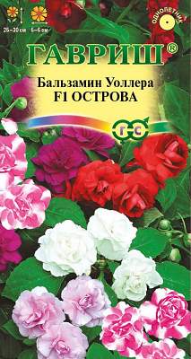 Бальзамин Острова F1 Уоллера махр. смесь. Великолепная смесь махровых и полумахровых гибридных сортов бальзамина. Растения однолетние, неприхотливые, до 25-30 см высотой, образуют пышный кустик. Цветки крупные, различных оттенков. Цветение обильное и продолжительное в течение всего сезона. Бальзамины хорошо растут в полутени. Предпочитают легкие плодородные почвы. Достаточно влаголюбивы, но не переносят избыточного переувлажнения. Размножают семенами, посев производят в марте-апреле в рассадные ящики. Посевы засыпают влажным песком слоем 3 мм и поддерживают постоянную влажность, для чего емкость накрывают стеклом и ставят в хорошо освещенное место. Всходы появляются через 14-20 дней. После появления всходов влажность субстрата и воздуха необходимо уменьшить, сняв покровное стекло. Сеянцы высотой 1 см, пикируют в горшки по одному растению. На открытый балкон растения выставляют в середине мая. Можно выращивать как комнатное растение. Смесь хорошо зарекомендовала себя в профессиональном озеленении.