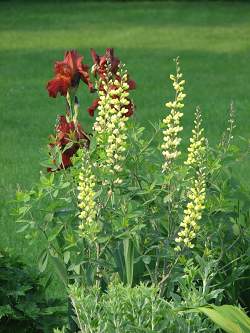 Баптизия Solar Flare (Солар Флэйр). Растение образует шарообразный куст. Листья зеленовато-сизые, тройчато-сложные. Цветы желтого цвета собраны в концевые кисти на верхушках стеблей, распускаются в июне и цветение длится около 3-х недель.