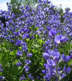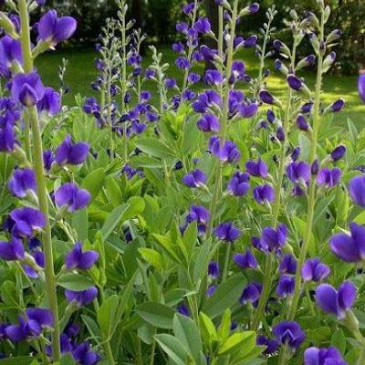 Баптизия южная. Растение образует шарообразный куст. Листья зеленовато-сизые, тройчато-сложные. Цветы насыщенного сине-фиолетового цвета собраны в концевые кисти на верхушках стеблей, распускаются в июне и цветение длится около 3-х недель.