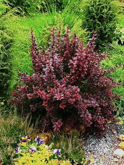 Барбарис Atropurpurea (Атропурпуреа). Отличается широокруглой, довольно крупной кроной с длинными годовыми приростами и насыщенно пурпурно-красно-коричневыми листьями. Красивый колючий кустарник. Листья весь сезон остаются пурпурно-красно-коричневыми. Крона густая, изначально вертикальная, с возрастом широкоокруглая. Листья мелкие, темно-красные или бордовые. Наиболее интенсивный цвет при распускании листвы.