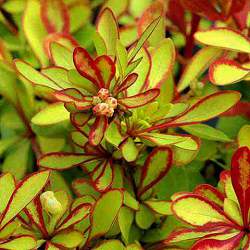 Барбарис Diabolicum (Диаболикум). Форма куста округлая, близкая к шаровидной. Листья мелкие, с изменяющейся окраской, весной нежно-розовые с красной каймой, летом имеют ярко-желтую окраску, осенью становятся оранжевыми. Побеги раскидистые с плотно расположенными на них листьями.