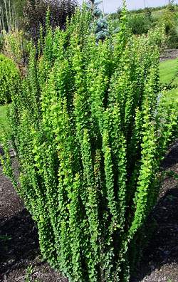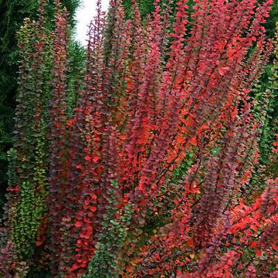 Барбарис Erecta (Эректа). Крона узкая, с возрастом раскидистая с многочисленными побегами. Цветы одиночные или в пучках, внутри желтые, снаружи красноватые. Плоды продолговатые, коралловые, блестящие, созревают в начале осени и долго держатся на растении. Листья мелкие, светло-зеленые, осенью окрашиваются в пурпурные тона.