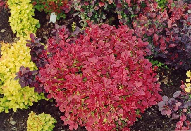 Барбарис Fire Ball (Файер Балл). Компактный медленнорастущий карликовый кустарник, достигающий 60-80 см. Крона округлая, плотная. Листья мелкие, с абсолютно ровным краем. Цветки небольшие, одиночные или в пучках по 2-5 шт., розоватые, особо не заметные, но появляющиеся им на смену ярко-красные ягоды украшают куст и после опадения листьев; осенняя окраска от оранжево-красноватой до красной.