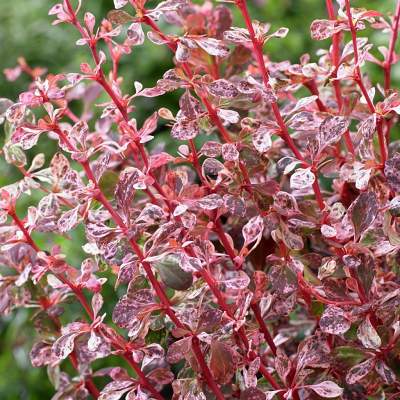 Барбарис Flamingo (Фламинго). Фламинго — это новый пестролистный сорт. Высота взрослого куста достигает 150 см. Компактная, густая крона формируется прямостоячими побегами лососевого цвета. Ее ширина не превышает 150 см. Ветки покрыты колючками.