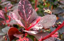 Барбарис Тунберга Фламинго — самый необычный и очень красивый сорт. Он прекрасен на фоне хвойных и любых лиственных культур. В любом дизайне территории станет центром композиции. Притягивает взор невероятным цветом густой кроны.
