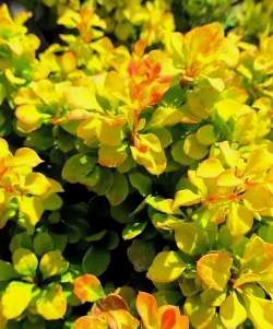 Барбарис Golden Devine (Голден Дивайн). Карликовый жёлтый барбарис с плотной шаровидной кроной, достигающий не более 70 см в высоту и 100 см в диаметре. Листья мелкие, лимонно-желтые, на солнце окраска листвы очень интенсивная, в осеннее время приобретают карминно-красный окрас.