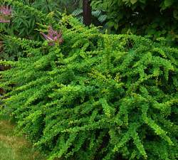 Барбарис Green Carpet (Грин Карпет). Крона подушковидная, раскидистая. Кора коричневато-желтая. Шипы трехраздельные. Листья светло-зеленые, мелкие, изящные, лопатчатые или почти округлые, длиной 1-3 см., сужающиеся у основания в короткий черешок. Осенняя окраска шарлахово-красная.