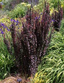 Барбарис Helmond Pillar (Хелмонд Пиллар). Кустарник шириной не более 0.5 м с многочисленными красными вертикальными побегами. Крона узкая, правильной колоновидной формы. Листья некрупные, пурпурно-красные, весной при распускании — несколько светлее, чем летом, осенью — алые. Многочисленные желтые цветы эффектно выделяются на фоне темной листвы. Плоды — блестящие, красные, долго держатся на кустах.