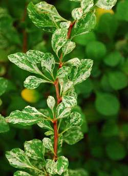 Густой колючий кустарник барбарис Тунберга Корник умеет удивлять! У этого растения замечательные светло-зеленые листья, сплошь покрытые бело-кремово-розовыми штришками. Цветки мелкие, но заметные благодаря своему яркому желтому окрасу. Этот великолепный декоративный сорт отличается также и своими красными плодами. К преимуществам барбариса Тунберга Корник следует отнести быстрый рост, высокую зимостойкость, нетребовательность к составу почвы.