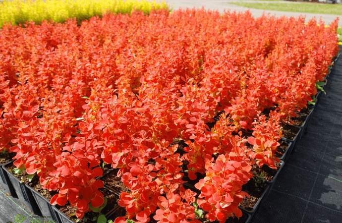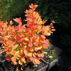 Барбарис Orange Ice (Оранж Айс). Компактный кустарник колонновидной формы. Высота до 70 см, диаметр до 50 см. Побеги вертикальные, прямые, побеги в юном возрасте красные. Листья овальные, апельсиново-медные, осенью красные, с желтыми всполохами. Прекрасный сорт для балконов, террас, посадки в контейнеры.