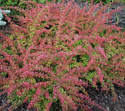 Барбарис Red Carpet (Ред Карпет). Кустарник диаметром до 1-1,5 м. Крона подушковидная, раскидистая. Кора коричневато-желтая. Листья красные или пурпурные, мелкие, изящные, лопатчатые или почти округлые, сужающиеся у основания в короткий черешок. Осенняя окраска шарлахово-красная. Цветет в конце мая — начале июня. Цветки одиночные или собраны в соцветия, внутри желтые, снаружи красноватые, расположены по всему побегу. Плоды эллипсоидальные, многочисленные, розовые или красные, созревают в сентябре.