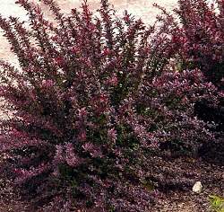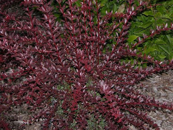 Барбарис Red Chief (Ред Чиф). Кустарник до 1,5 м в ширину с большим количеством колючек, колючки длинные и прочные. Форма кроны раскидистая с дугообразно изогнутыми побегами, ярко-красного цвета. Узкие кожистые блестящие листья имеют очень насыщенную тёмно-пурпурную окраску с коричневато — черным оттенком. На ярком солнце листья зеленеют.
