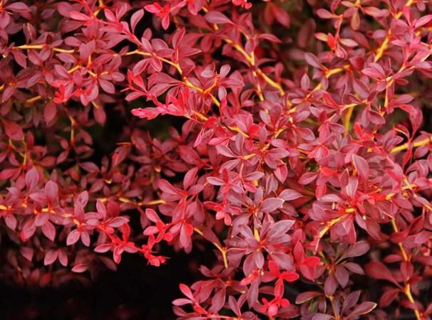Барбарис Red Dream (Ред Дрим). Изящный раскидистый кустарник. Растет относительно медленно, годовой прирост 10 см. Листья мелкие, овально-яйцевидные, темно-красного цвета с бордовым оттенком. Ветви раскидистые, длинные, с темно-коричневой корой и острыми шипами. Цветет многочисленными желтыми мелкими цветками в мае-июне. Плоды продолговатые, кораллово-красные, блестящие, созревают в начале осени и долго держатся на кусте.