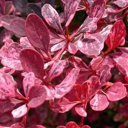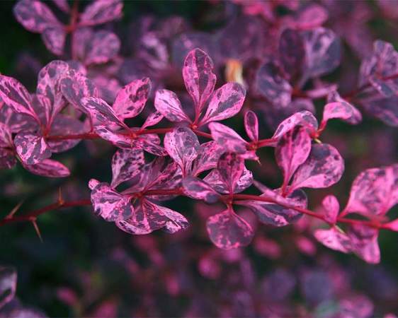 Барбарис Rose Glow (Роуз Глоу). Пурпурные листья покрыты бело-розовыми и серебристыми полосками и пятнами, как брызгами. Пестрая окраска проявляется с началом роста однолетних побегов, до этого момента куст одноцветный. Цветет в конце мая — начале июня.