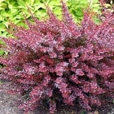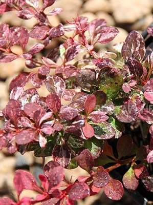 Барбарис Rosetta (Розетта). Колючий декоративный шаровидный лиственный кустарник с оригинальными пестрыми листьями. Высота взрослого растения не превышает 1,5 м. Молодые листья ярко-пурпурной окраски с розово-серыми и мраморными бронзово-красными разводами. Взрослые листья красно-пурпурной и тёмно-розовой окраски, с сероватыми пятнами и брызгами. Степень окраски листа будет зависеть от освещённости места, на котором посажен кустарник. Если растение расположено в тени, то декоративность листа теряется.