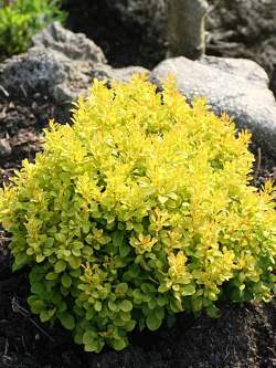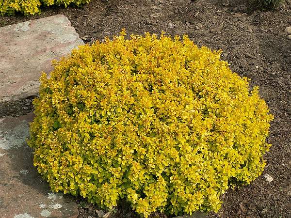 Барбарис Special Gold (Спешл Голд). Карликовый медленнорастущий кустарник с короткими побегами и небольшими колючками. Высота кустарника 20-30 см. Листья мелкие, округлые, плотно расположены на побегах, желтовато-зеленого цвета. Цветки желтые, плоды красного цвета.