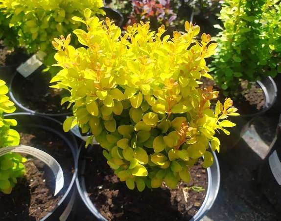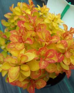 Барбарис Summer Sunset (Саммэ Сансет). Куст колонновидной формы, высота 150 см. Молодой прирост оранжевого цвета. Листья очень декоративные, мелкие, круглые, жёлто-зелёные с оранжево-красными краями. Цветёт в мае жёлтыми цветками. Плоды красные.
