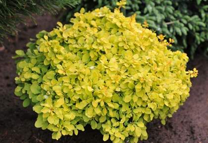 Барбарис Tiny Gold (Тайни Голд). Карликовый медленнорастущий кустарник, с шаровидной компактной кроной. Побеги желто-коричневого цвета, покрыты острыми шипами. Листья мелкие, обратнояйцевидные, золотисто-желтого цвета, длиной до 3 см, могут иметь розовые или красные края летом, на солнце не выгорают.