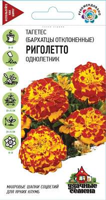 Бархатцы откл. Риголетто (Тагетес). Бархатцы — широко распространенные в декоративном озеленении растения, Куст цветущий, с сильноветвистыми от основания побегами, высотой 20-25 см. Листья ажурные, перисторассеченные. Соцветия махровые, кармино-коричневые с золотисто-желтыми пятнами диаметром 5-6 см. Цветение продолжительное в течение всего лета. Бархатцы светолюбивы и теплолюбивы, засухоустойчивы. К почвам нетребовательны, но предпочитают плодородные легкие почвы. Выращивают, как правило, рассадным способом. Используют для посадки на клумбах, рабатках, бордюрах, в балконные ящики, можно использовать, как горшечную культуру.