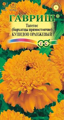 Бархатцы пр. Купидон оранжевый (20 см) (Тагетес). Однолетнее растение семейства Сложноцветные. Стебли прямостоячие, 20 см высотой, сильно ветвистые от основания, боковые побеги отклоненные. Соцветия-корзинки яркого оранжевого цвета, 10-12 см в диаметре. В открытый грунт можно высевать в конце мая — начале июня. Всходы появляются на 5-10 день. Почву желательно накрыть нетканым материалом (акрил, лутрасил). В этом случае сеять можно на неделю-полторы раньше обычных сроков и тем самым ускорить цветение. На рассаду сеют в начале апреля. Цветение начнется в июне. Бархатцы, высаженные рядом с огородными культурами уменьшают их поражение грибными заболеваниями, особенно фузариозом, защищают от некоторых видов нематод. Бархатцы используют во всех видах цветников. Они хорошо растут в горшках, вазонах, балконных ящиках, в сочетании с примулами и цинерариями. Осенью цветущие растения можно перенести в комнату, где они прекрасно растут в течение зимы, а весной, высаженные в открытый грунт, образуют большой цветущий куст.