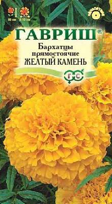 Бархатцы прямостоячие Жёлтый Камень 0,3 г. Однолетнее растение семейства Сложноцветные. Высотой до 80 см, сильно ветвистое от основания, боковые побеги отклоненные. Соцветия — корзинки до 15 см в диаметре, густомахровые, шаровидные, золотисто-жёлтой окраски.