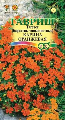Бархатцы тонколист. Карина оранжевая (Тагетес) DH. Обильно цветущий сорт для ярких нарядных цветников. Растение сильноветвистое, формирует раскидистый кустик с изящными перисто-рассеченными листьями. В пору цветения растение похоже на цветущий шар, усыпанный оранжевыми соцветиями-корзинками до 3 см в диаметре. Бархатцы теплолюбивы и светолюбивы, засухоустойчивы, отзывчивы на плодородие почв. Высаженные рядом с огородными культурами, они уменьшают их поражение грибными заболеваниями, особенно фузариозом, защищают от некоторых видов нематод. На рассаду высевают в начале апреля. В открытый грунт можно высевать в конце мая —