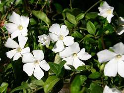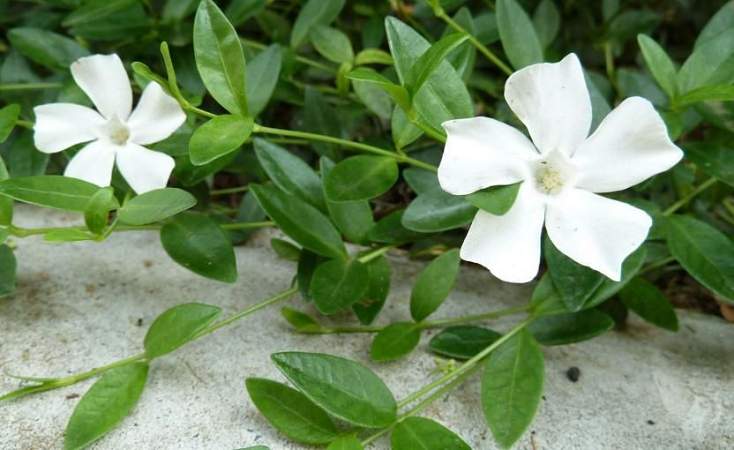 Барвинок Alba (Альба). Листья ярко-зеленые, цветки белые, крупные. Вечнозелёное неприхотливое растение. Создает плотный стабильный декоративный покров. Цветение интенсивное. Побеги длинные, эластичные, ползущие по земле и пускающие корни узлами, создавая красивое покрытие и цветочные — поднятые на высоту 10-15 см.