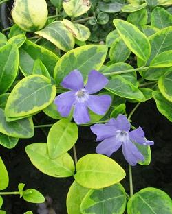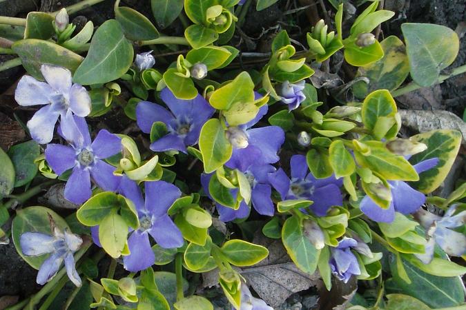 Барвинок Blue and Gold (Блю энд Голд). Многолетнее вечнозеленое стелющееся растение с ветвистым стеблем до 50 см длиной. Цветки синие, период цветения с мая по сентябрь. Листья имеют неровное золотистое окаймление по краю.