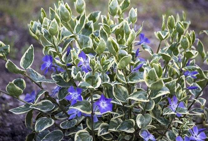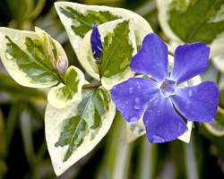 Барвинок Variegata (Вариегата). Листья изумрудно-зеленые с белой или розоватой каймой. Цветки крупные, синие. Вечнозелёное стелющееся растение. Быстро нарастает и создает плотный стабильный декоративный покров. Растение нетребовательно к почве, хотя значительно лучше разрастается и дольше цветёт на рыхлых плодородных почвах с нейтральной реакцией.