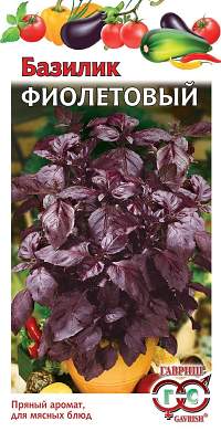 Базилик Фиолетовый. Среднеспелый (60-70 дней от всходов до технической спелости) сорт. Выращивается в рассадной культуре. Посев на рассаду конец марта — начало апреля. Высадка рассады в грунт начало июня. Схема посадки 30х30см. Растение прямостоячее, высотой 60 см, полураскидистое. Листья крупные, удлиненно-яйцевидные, с зубчатым краем, темно-зеленый с сильным антоцианом. Цветок розовый. Аромат сильный, пряный. Базилик предпочитает хорошо структурированные, богатые гумусом почвы. Нуждается в регулярных поливах. Используется в свежем виде в качестве салатной зелени и пряновкусовой добавки, а также натурального ароматизатора в кулинарии и при консервировании.