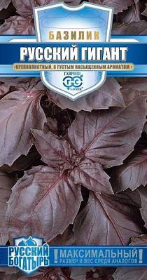 Базилик Русский гигант фиолетовый. Среднеспелый (от всходов до технической спелости 65-70 дней) сорт с очень крупными широкими темно-фиолетовыми листьями. Благодаря высокому содержанию эфирных масел, растение имеет густой, насыщенный аромат и вкус с легкими нотками гвоздики. Используют в качестве салатной зелени, приправы к мясным и рыбным блюдам. Образует компактный кустик, высотой 30-40 см с удлиненно-яйцевидными слабо пузырчатыми листьями. Сорт подходит для горшечной культуры, очень привлекательно смотрится в кухонном интерьере. Выращивают рассадным способом или прямым посевом в открытый грунт. Посев на рассаду производят в конце марта — начале апреля. Посев в грунт в мае или начале июня. Высадка рассады в грунт — начало июня. Схема посадки 30x30 см. Предпочитает хорошо структурированные, богатые гумусом почвы. Нуждается в регулярных поливах.
