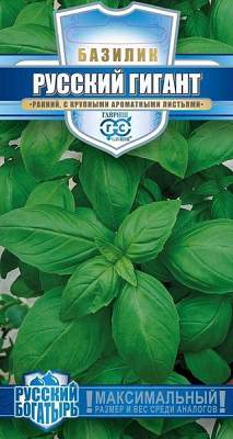 Базилик Русский гигант зеленый. Ранний (от всходов до технической спелости 50-60 дней) сорт крупнолистного базилика с зелеными, сладкими листьями впечатляющего размера. Приятный гвоздичный вкус и пряный аромат придаст пикантности салатами и супам, гармонично дополнит блюда из рыбы и мяса, прекрасно сочетается с чесночным соусом. Растение прямостоячее, высотой 50-60 см. Базилик обладает тонизирующими свойствами, улучшает пищеварение.