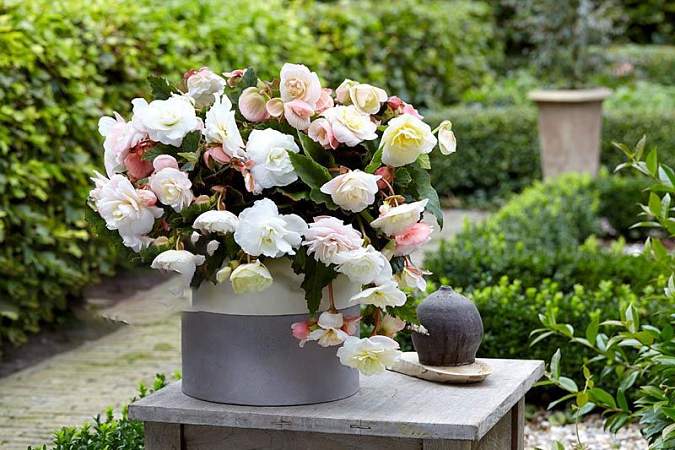 Бегонию Odorosa White Blush (Одороса Уайт Блаш). Высота растения 20-30 см. Цветы крупные, махровые, диаметром до 9 см, на длинных цветоносах, ароматные. Окраска белая с розовым румянцем. Лепестки с волнистыми краями. В слегка затененных местах цветки вырастают гораздо крупнее, чем на открытом солнце. Прекрасно смотрятся в подвесных корзинах, в композициях с кустарниковыми растениями или высокорослыми цветами.
