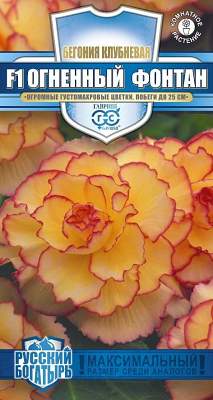 Бегония Огненный фонтан F1 гранул. 4 шт. пробирка, серия Русский богатырь Н19. Великолепные крупные бегонии, отвечающие самым высоким требованиям профессионального выращивания. Побеги мясистые, до 20-25 см, с большими листьями и огромными густомахровыми цветками яркой желто-оранжевой окраски с красным ободком по краю. Цветение обильное, с мая по октябрь. Предпочитают плодородные почвы со слегка кислой реакцией, светлые или слегка затененные помещения, температура в которых не должна превышать 23°С. Хорошо отзывается на подкормку минеральными и органическими удобрениями. Полив умеренный, на солнечных местах обильный. Размножают клубневые бегонии семенами, клубнями и черенками.