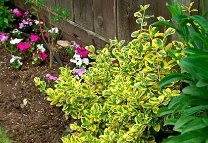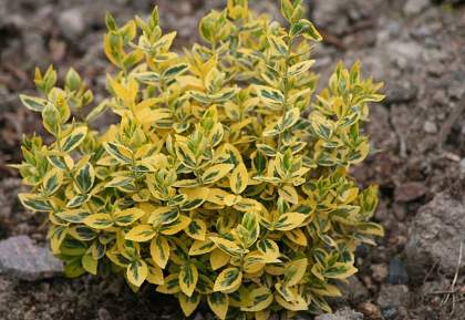 Бересклет форчуна Emerald Gold (Эмералд Голд). Вечнозеленый стелющийся кустарник, достигает в высоту 30 см. Листья зеленые с желтой каймой, кожистые, блестящие, очень декоративные.