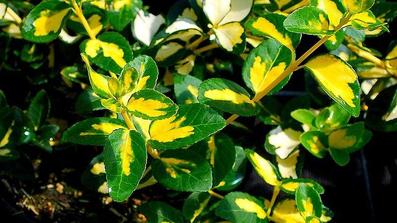 Бересклет форчуна Sunspot (Санспот). Вечнозеленый стелющийся кустарник, достигает в высоту 30 см. Листья зеленые с большим желтым всполохом по центру, кожистые, блестящие, очень декоративные.