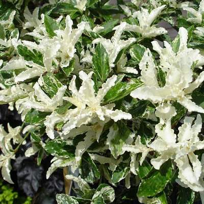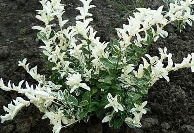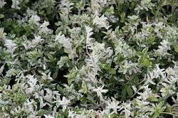 Бересклет Форчуна Harlequin (Арлекин). Почвопокровный ползучий кустарник с плотной кроной и длинными побегами. Достигает 50 см в высоту и 100 см в ширину. Годовой прирост около 20 см.