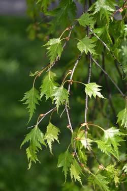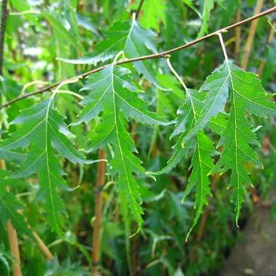 Береза Crispa (Криспа). Листопадное дерево высотой 20-25 м с узкой ажурной кроной и прямым стволом, основные ветви растут под острым углом, боковые ветви плакучие. Листья с неравнозубчатыми краями, глубоко рассеченные. Кора чисто-белая, тонкая. В Известна с 1767 г (найдена в лесу на юге Швеции, в Далекарлии). Листья зеленые, осенью — с ровной желтой окраской. Отличаются характерными неравнозубчатыми краями, глубоко рассеченные.