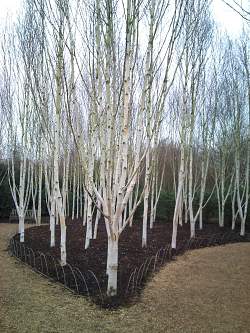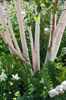 Береза Jacquemonti (Жакмана). Высота растения 3-4 м. Ширина растения 2-2,5 м. Высота и ширина растения указаны примерно в возрасте 10 лет. Белоснежный гладкий ствол и "кустовая" форма роста делают эту березу уникальной для создания композиций в садах средних и относительно крупных размеров.