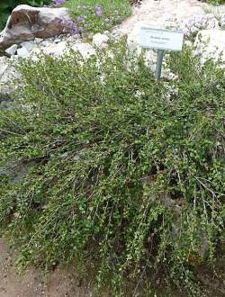 Но в условиях средней полосы России это прямостоячий кустарник. Тёмно-вишнёвые ветви в молодом возрасте бархатистые, усеяны массой мелких округлых и блестящих зубчатых по краю листочков сочно-зеленого цвета 20-30 мм в диаметре. Отличная подсадка к более высоким кустарникам. Также хороша как основа в невысоких миксбордерах.