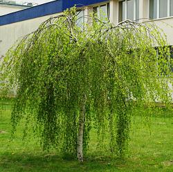 Береза Youngii (Юнги). Высота растения 2-2,5 м. Ширина растения 2-2,5 м. Высота и ширина растения указаны примерно в возрасте 10 лет. Формирует красивую зонтичную форму.