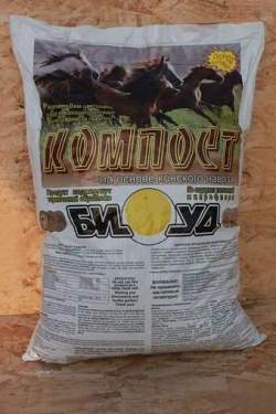 Компост на основе конского навоза. Это биоорганическое удобрение, выпускаемое под торговой маркой "БИУД", может использоваться при посадке и выращивании любых растений. Для его создания используются как традиционные приемы компостирования, так и финские технологии. Основой для создания компоста "БИУД" служит низинный торф, торф верховой, конский навоз.