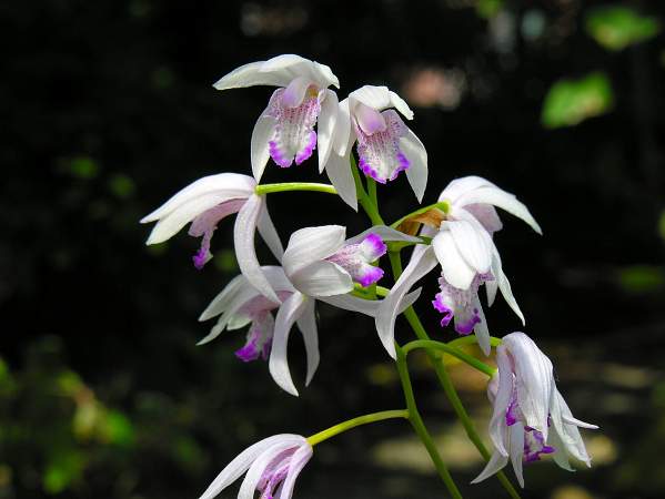 Блетилла полосатая Kuchibeni (Кутибэни). Цветки маленькие белые с сильным розовым или светло-фиолетовым румянцем на кончике губы. Цветки собраны в соцветия. Цветение длительное, в июне-июле. Стебли тонкие, высотой 45-60 см. Листья высотой 25-35 см.