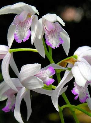 Блетилла полосатая Kuchibeni (Кутибэни). Цветки маленькие белые с сильным розовым или светло-фиолетовым румянцем на кончике губы. Цветки собраны в соцветия. Цветение длительное, в июне-июле. Стебли тонкие, высотой 45-60 см. Листья высотой 25-35 см.