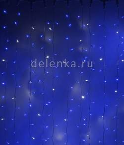 Бликующий занавес (Прозрачный провод, высота 3 м). Предназначен для декоративного оформления различных плоскостей: витрин магазинов, фасадов зданий, оконных проемов, для декорирования объемных форм (колонны, козырьки, перила, входные группы). Идеально подходит для светодизайна как внутри, так и снаружи помещений. Возможность последовательного соединения, низкое электропотребление и несложный монтаж делают световой занавес одним из самых популярных средств в области декоративного светового оформлен.