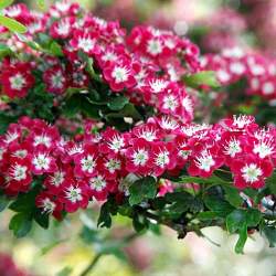Боярышник Crimson Cloud (Кримсон Клауд). Кустарник или деревце высотой до 4 м. Кора гладкая, темно-серая. Листья очередные, рассечены на 3-5 (7) лопастей, сверху темно-зеленые, снизу светло-зеленые. Цветки крупные, диаметром до 2 см, темно-красные с белым центром.