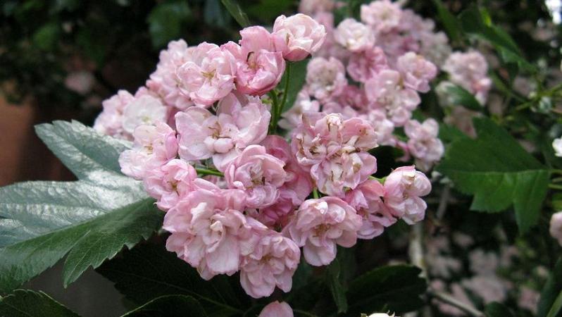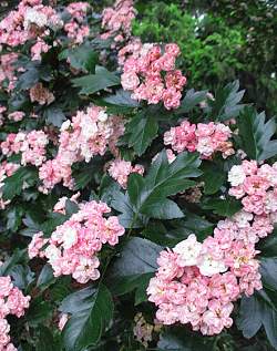 Боярышник Toba (Тоба). Крона широкая, шатровидная. Листья глубоколопастные, темно-зеленые, глянцевые, блестящие. Высота дерева 3-4 м. Махровые цветки во время цветения меняют окраску с ярко-розовой до белой. Цветет в конце мая — начале июня. Размножается только прививкой на другие виды боярышника. Красив как в одиночных посадках, так и в группах. Практически не имеет колючек.