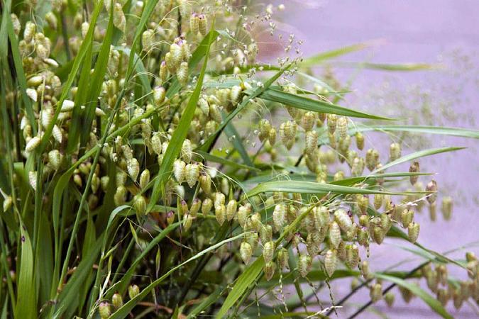 Бриза (трясунка) средняя. Многолетник до 45 см высотой. Метелки 5-12 см длиной, широко-раскидистые, колоски с 5-10 цветками, обычно пестро окрашенные. Цветет в начале весны — конце лета.