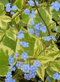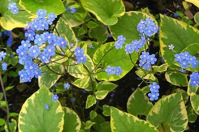 Бруннера Hadspen Cream (Хадспен Крим). Нарядный сорт с вариегатными листьями. Листья крупные, сердцевидные, голубовато-зеленые с желто-кремовой каймой. Цветки голубые. Цветет в июне-июле.