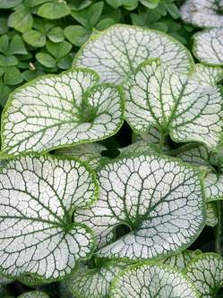 Бруннера Jack Frost (Джек Фрост). Крупная сердцелистная серебристая листва с тонкими зелеными нитками прожилок. Мелкие голубые цветы поздней весной. Предпочитает тень, сохраняет декоративность до поздней осени.